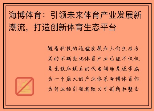 东赢体育作为国内领先的体育产业创新企业,一直致力于推动体育产业的转型升级,并且积极参与到全民健身事业的发展中。其不仅在技术创新方面不断突破,还在市场运作、品牌建设和全民健身普及等多个领域取得了显著成绩。本文将从四个方面详细阐述东赢体育如何引领体育产业的创新发展,并助力全民健身事业的蓬勃腾飞:一是体育...